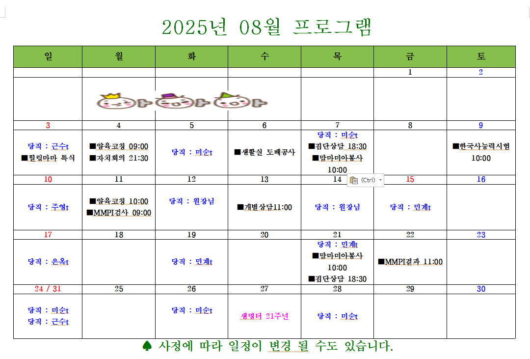 [ÀÏÁ¤] 2025³â 08¿ù ÇÁ·Î±×·¥ ÀÏÁ¤Ç¥