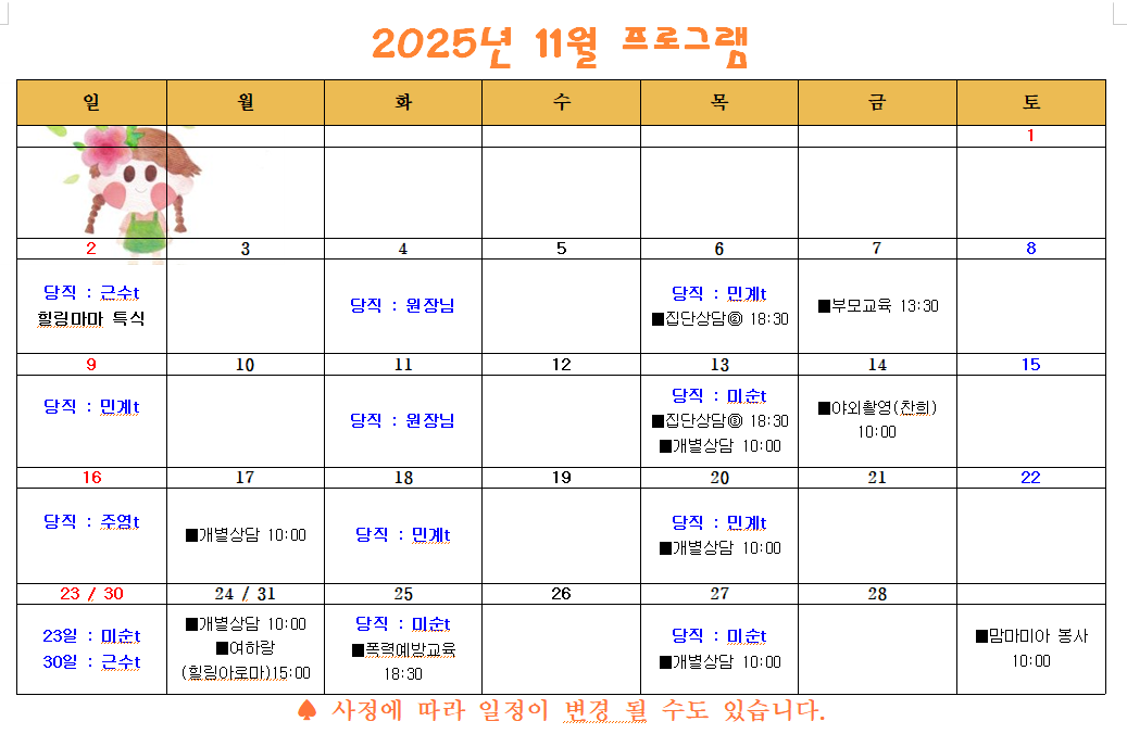 [ÀÏÁ¤] 2025³â 11¿ù ÇÁ·Î±×·¥ ÀÏÁ¤Ç¥