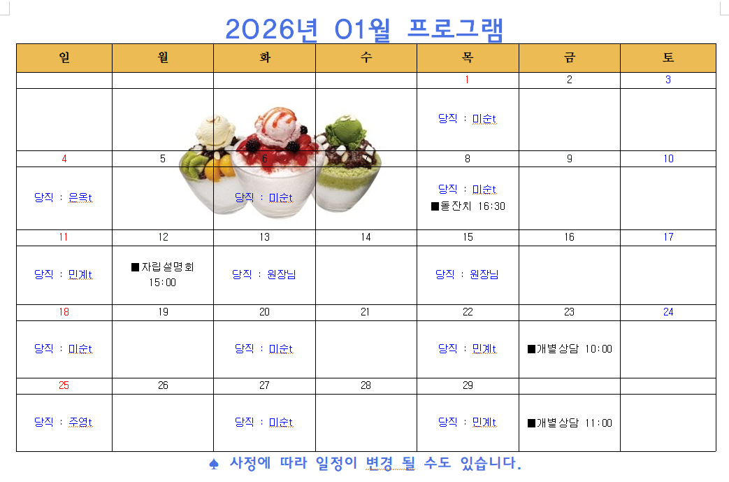 [ÀÏÁ¤] 2026³â 01¿ù ÇÁ·Î±×·¥ ÀÏÁ¤Ç¥