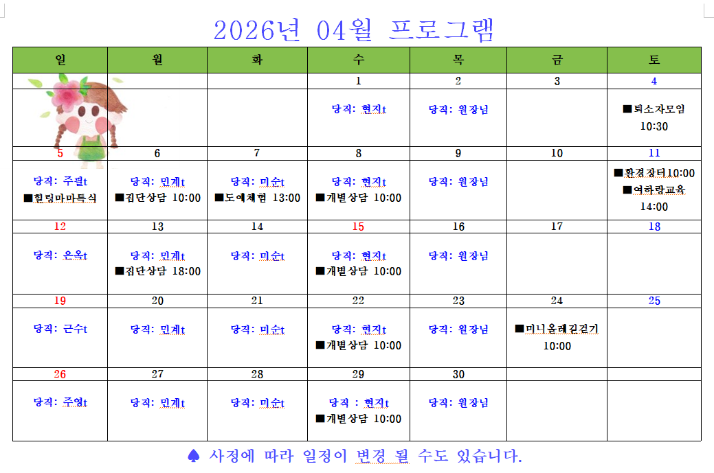 [ÀÏÁ¤] 2026³â 04¿ù ÇÁ·Î±×·¥ ÀÏÁ¤Ç¥